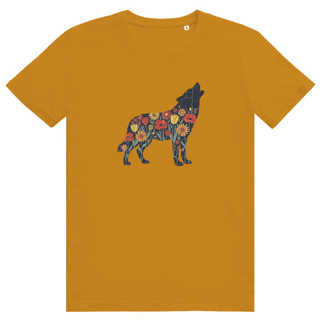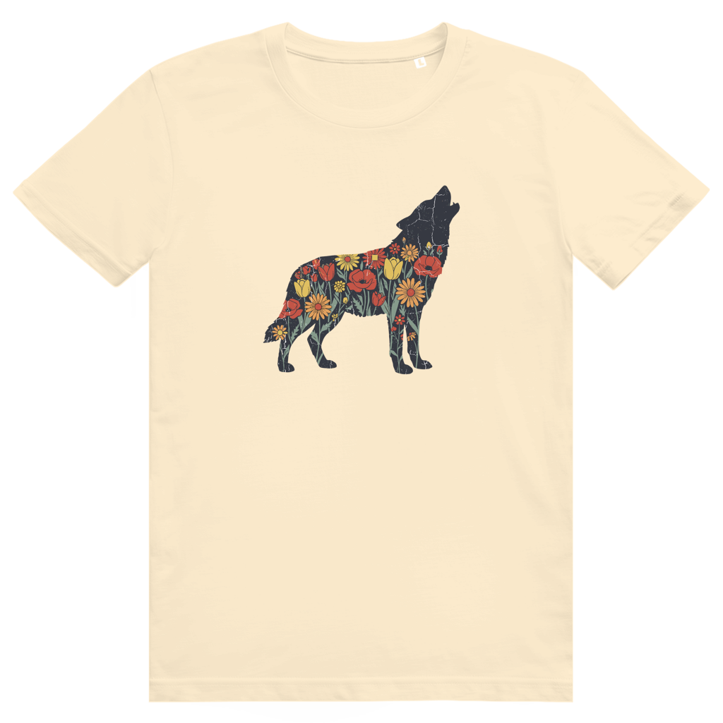 Der Wolf – Symbol für Freiheit, Instinkt und Wildnis. In seiner Silhouette: eine Explosion von Wildblumen. Dieses T-Shirt ist für alle, die wild geblieben sind und trotzdem im Einklang mit der Natur leben.